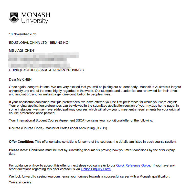 经过以上努力,她最终荣获了莫纳什大学(2022年QS排名58)和麦考瑞大学(QS排名200)的专业会计硕士offer以及卡迪夫大学(2022年QS排名151)和萨里大学(2022年QS排名272)的会计与金融硕士offer。
