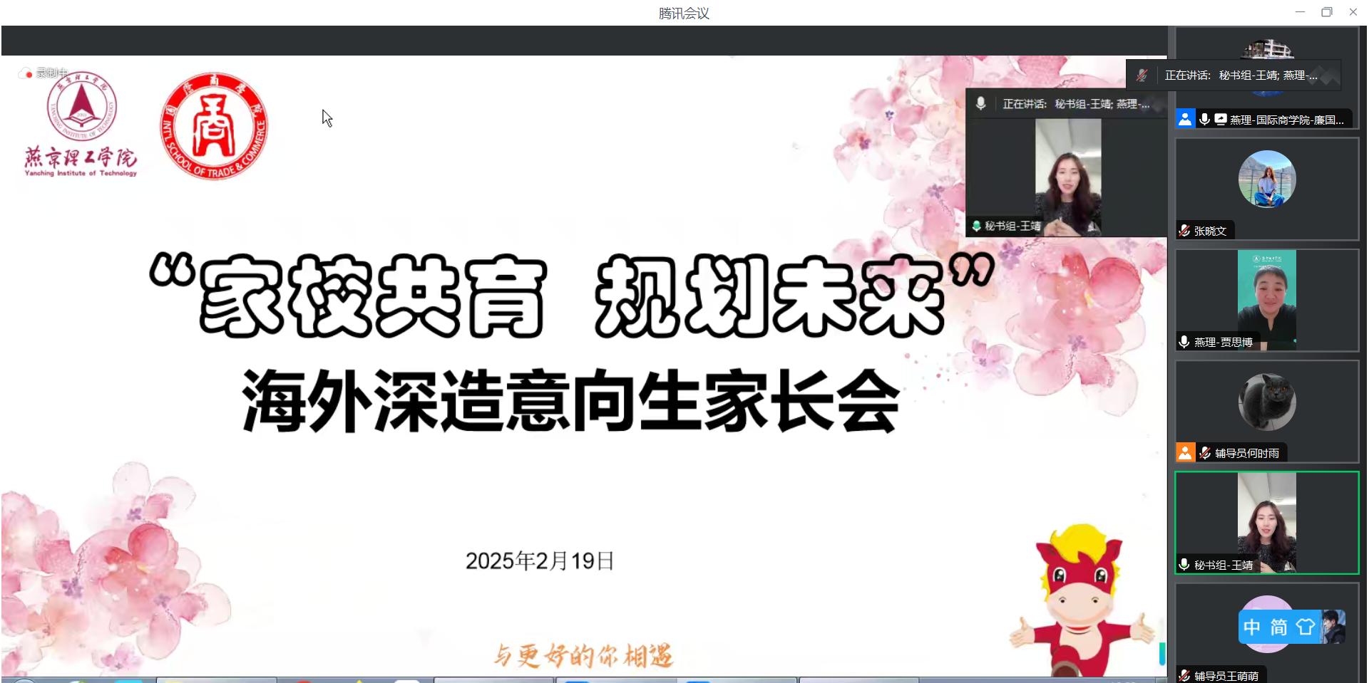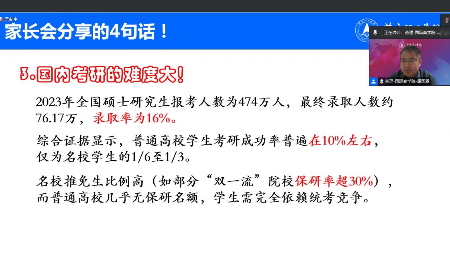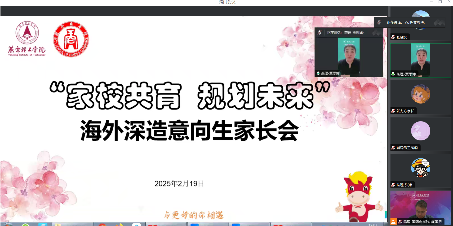 为推动家校共育,共同促进学生成长,加深家长对学院人才培养机制的了解,2月19日,国际商学院于线上召开了“家校共育,规划未来”海外深造意向家长会。国际商学院院长廉国恩、党总支书记贾思博、副院长张琪、学院优秀毕业生代表王靖、各年级辅导员老师以及部分学生家长参加此次会议,会议由贾思博书记主持。