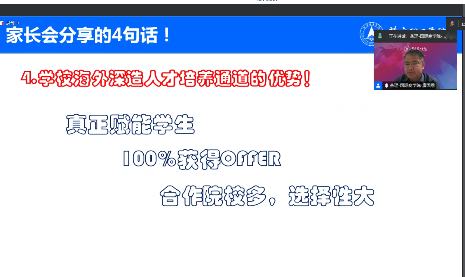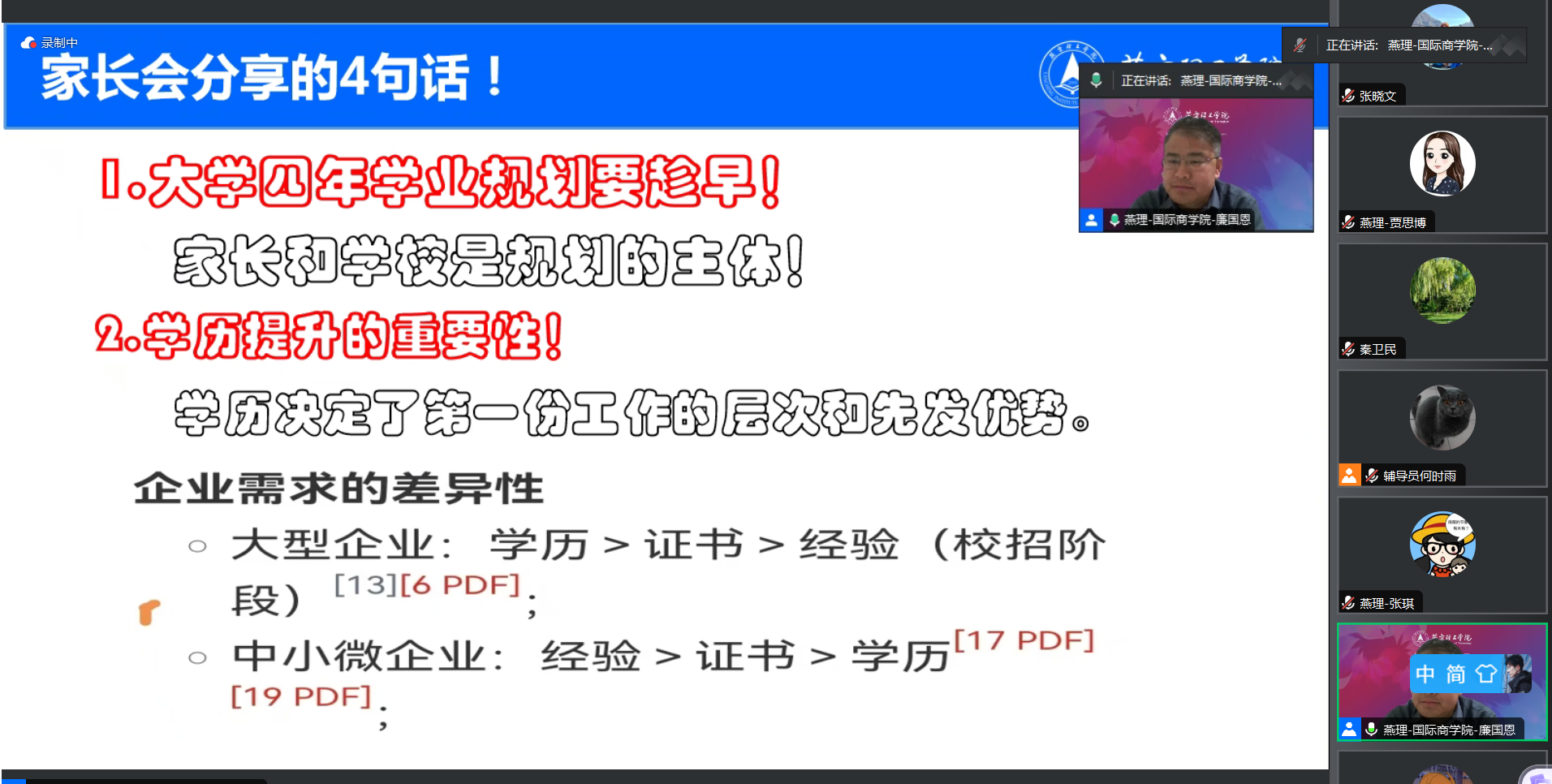 廉院长首先强调了学院重视学生全面发展,为同学们提供了丰富课程、实践项目与国际交流机会,助力学生全面成长。同时,廉院长建议家长与同学们要提前做好学业规划、职业规划,明确发展目标;增强本领,为以后的职业发展打下坚实的基础。随后,廉院长与家长们深入探讨了学历在当今社会的重要性及其影响,他表示,学历不仅关乎学生未来的职业发展,也影响着他们的社会地位和个人成长。廉院长分享了燕京理工学院与世界名校牵手的成功案例,以及学院与全球多所海外高校实现课程对接、构建多层次国际联合培养模式的经验,廉院长指出,海外深造项目是学校搭建的另外一条人才培养通道,这条通道不仅为学生提供了更多的发展机会,还能够让他们接触到不同的教育理念和文化氛围,从而拓宽视野,提升综合素质。