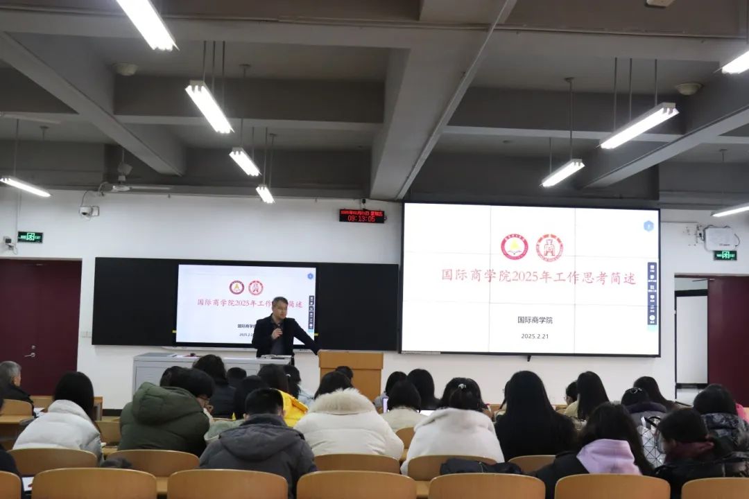 为全面部署2025年春季学期重点工作,进一步凝心聚力,全力推进各项工作落地见效,国际商学院于2月21日在综合楼101召开全体教职工大会。国际商学院院长廉国恩、党总支书记贾思博、副院长张琪以及学院全体教职工参加此次会议,会议由廉国恩院长主持。