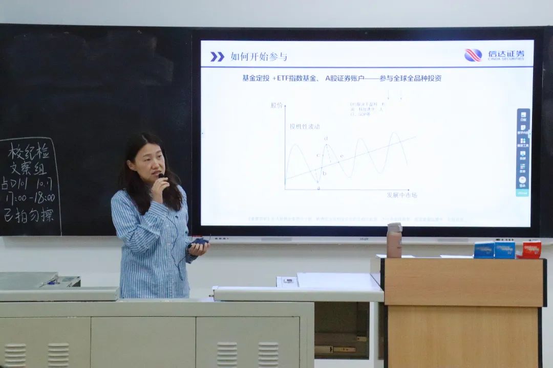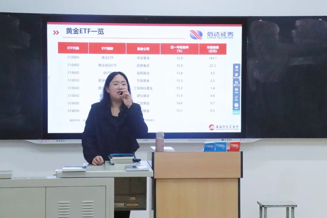 谷雪老师表示,ETF是当下最热门,年轻人进入市场最容易使用的投资工具,而ETF正如直播间的主播,是投资界的一颗闪耀新星。谷雪老师强调,当前跨境ETF、计算机行业ETF、医药行业ETF、食品行业ETF都在蓬勃发展,而ETF的宽基指数、行业主题指数、策略指数、跨境指数、债券指数、商品指数六种指数资产能够以低成本、高效率的形式追踪市场热点,一站式解决资产配置难题。现场的同学们以饱满的热情和精神认真听讲,并表示谷雪老师的讲解为他们提供了宝贵的学习机会,对未来的投资理财之路有了更加清晰的认识和规划。