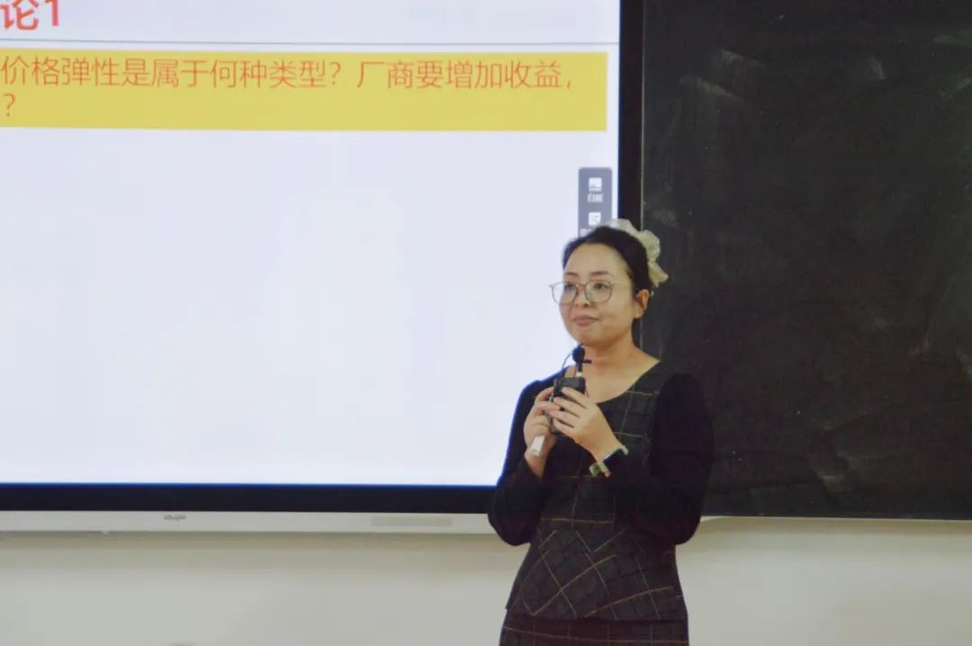 张欣蕾老师展示了《西方经济学》课程中“需求价格弹性”的教学内容。她采用“实验、案例、项目三位一体”的教学模式,结合日常生活中的商品实例,深入浅出地阐述了“需求价格弹性”的概念。张老师强调,在授课过程中,教师应重构教学内容,简化复杂的数学推导,回归知识本质,以加深学生对课堂知识的理解。荣华英老师和王洁老师对张老师的授课进行了点评。两位老师认为其教学思路清晰,能够紧密联系实际,将理论知识应用于现实情境中,有效提升了学生对知识的理解和掌握。张老师以学生为中心的授课方式及明确的引导,为在场的教师提供了深刻的启示。