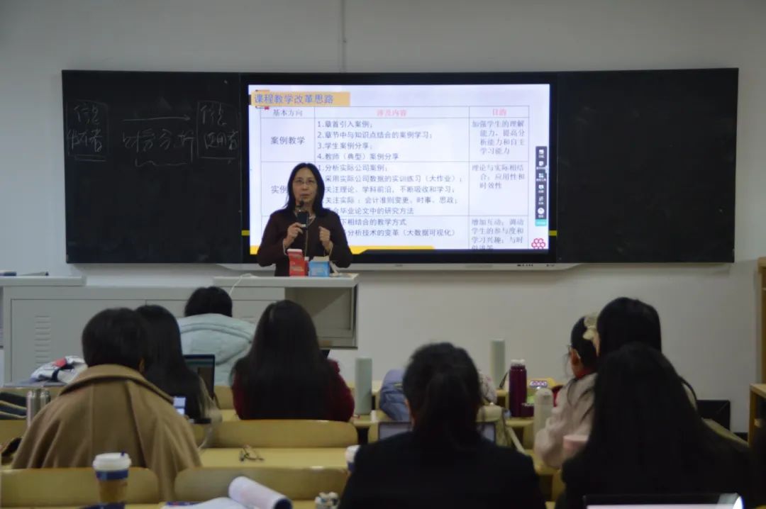 孙小清老师对《财务分析》课程中的“利润表一般分析”进行了深入剖析。她以案例、实例和多元化教学为基本方向,详细讲解了“利润表概述”的重点内容。孙老师认为,综合课程应具备应用性和时效性,以帮助学生更好地理解和分析知识。同时,孙老师注重将课堂知识与实际生活相结合,她围绕当前经济形势进行授课,使课程内容与现实紧密相连,增强了课堂的实际意义。尹晶老师和常彬彬老师在点评中一致认为,孙老师的授课充满激情,展现了她丰富的教学经验和充分的准备,PPT内容的及时更新、教学层级的细致规划以及详尽的板书设计,均让参与的教师受益匪浅。