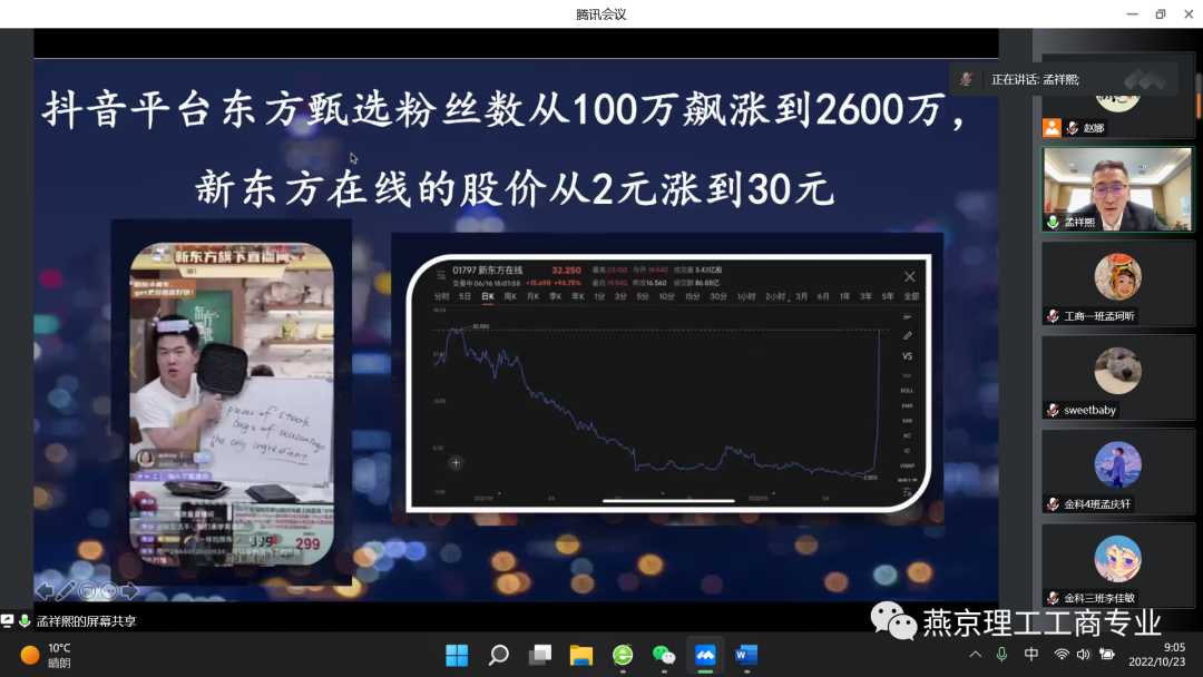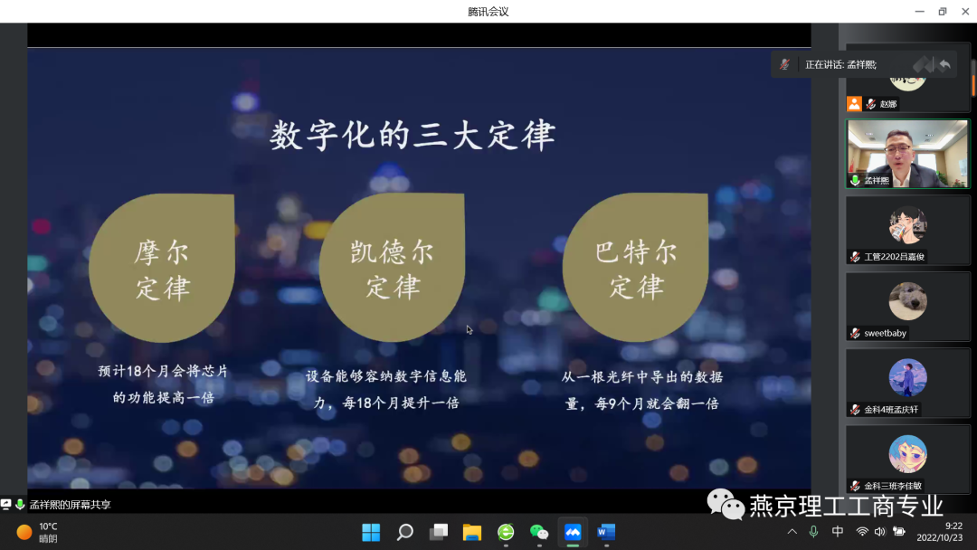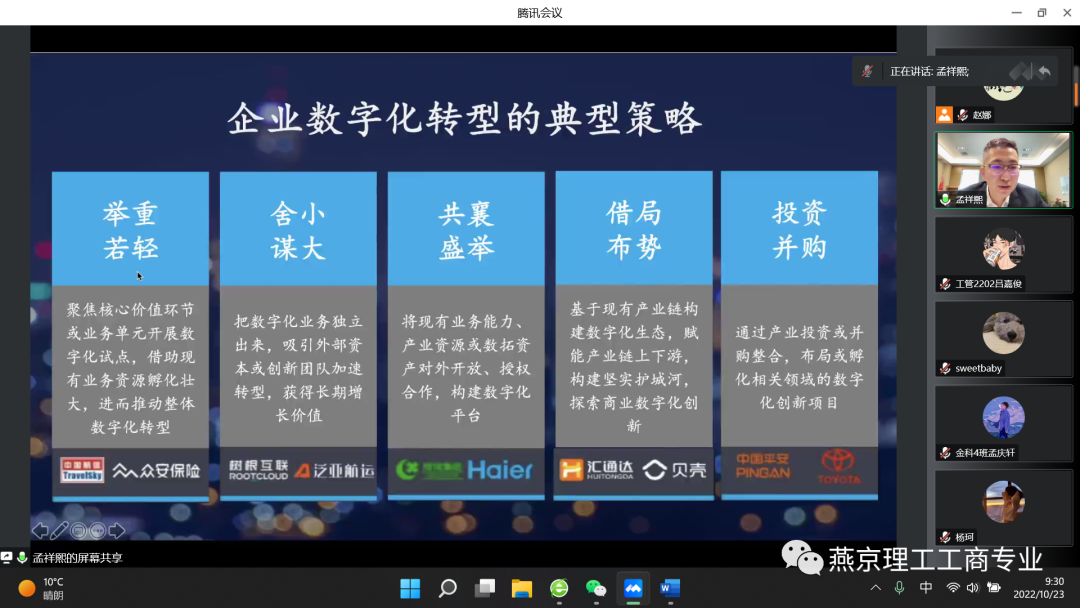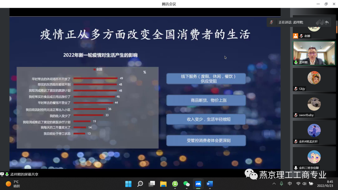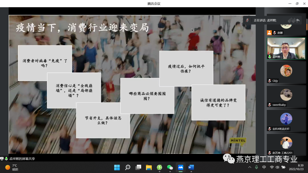 为了加深学生的专业认知,拓展学生管理学课程视野,10月23日,工商管理教研室特邀请孟祥熙总经理给学生带来了主题为后疫情时代-新常态·新心智·新消费的前沿讲座。