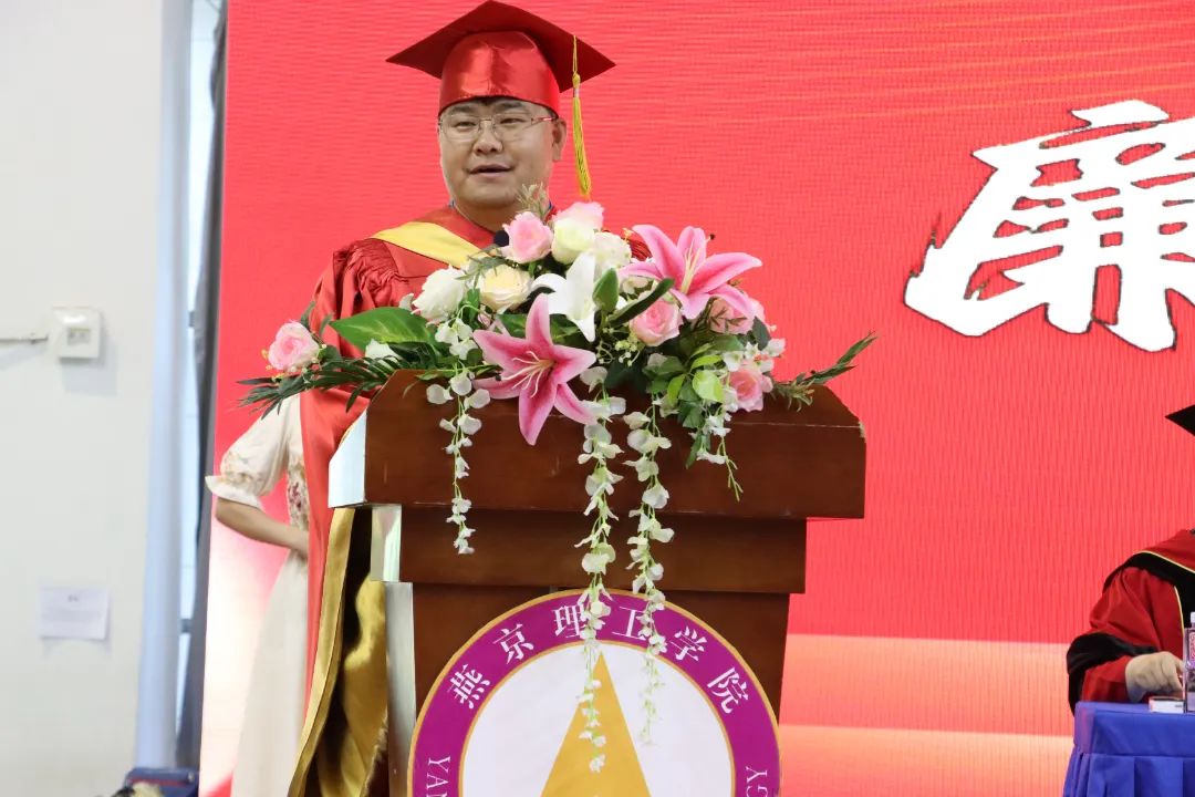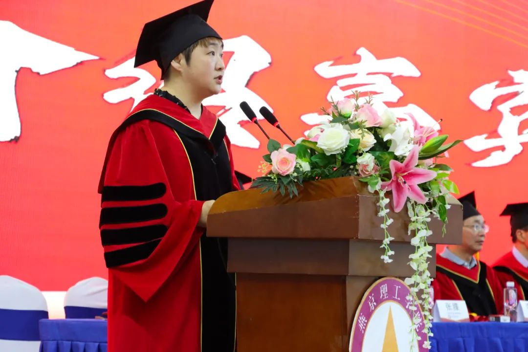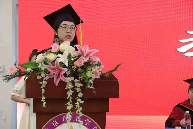 教师代表李倩玮发言:四年燕理时光让大家始终树立坚定的理想信念,志存高远,不畏艰难,践行着燕理“勤奋创新,璞玉成器”的校训精神,让久违的梦想生根发芽。