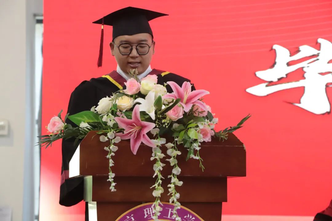毕业生代表刘泉江表示大学四年是青春时代最为靓丽的篇章,受新冠疫情影响,大学时代的生活更加弥足珍贵。随后,他代表全体毕业学子对四年里老师的辛勤教导表示感谢。并希望同学们能够在未来各自的世界里熠熠生辉,愿此去繁花似锦,归来仍是少年!
