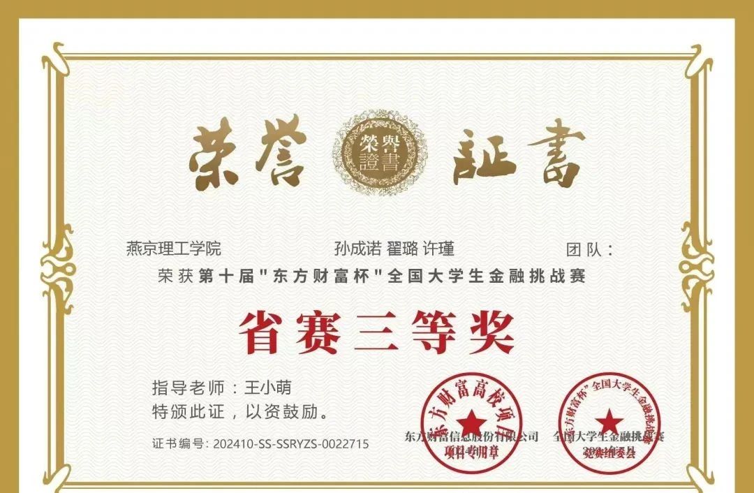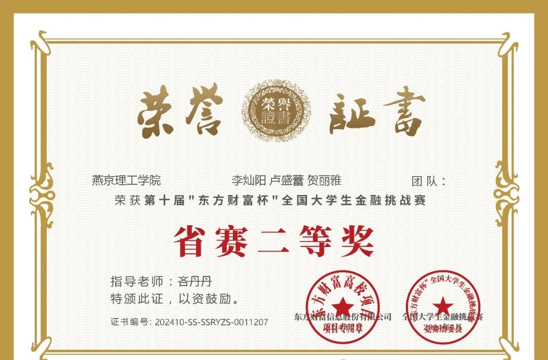 2024年9月6日,燕京理工学院的学生们在第十届“东方财富杯”全国大学生金融挑战赛中表现出色,获得了多项荣誉。“东方财富杯”全国大学生金融挑战赛是由东方财富主办的一项金融赛事,旨在通过模拟交易、金融知识竞赛等形式,提高大学生的金融素养和实际操作能力。