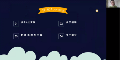开始之前,邹思念对自己目前从事的行业和岗位做了简短的介绍。然后详细介绍了互联网人力资源的“三支柱(SSC、HRBP、COE)”组织架构,通过分享同学们对人力资源真实的岗位情况有了清晰的认识。在分享的过程中,强调了招聘工作的重要性,并就“招聘发展的趋势”、“招聘的职责”、“招聘的流程和工具”、“招聘渠道”、“招聘素养”、”简历的筛选”几大方面,结合工作中实际遇到的案例做出了具体而全面的解析。