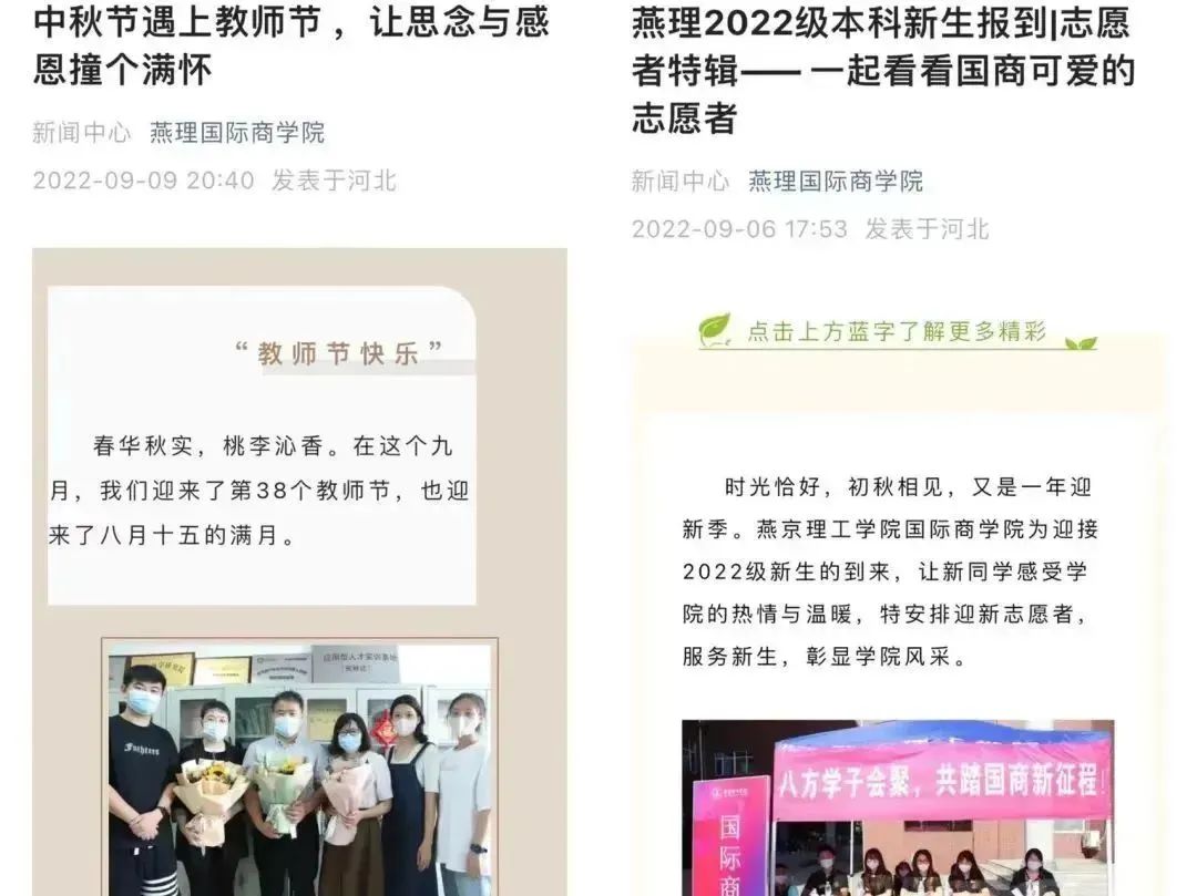 微信运营部主要负责对微信公众号的日常维护,发布文章、回复留言,积极及时地将新闻部和摄影部审核无误的活动资料及新闻稿件上传到公众号平台, 与新闻部做到实现”上情下达”和”下情上传”的一个重要途径, 利用网络充分发挥宣传作用。 除了对微众号的运营外,每逢重要节庆日, 重要纪念日等,开发制作H5网页,运营国商官方视频号, 达到宣传学院精神,弘扬主旋律,传播正能量的效果。