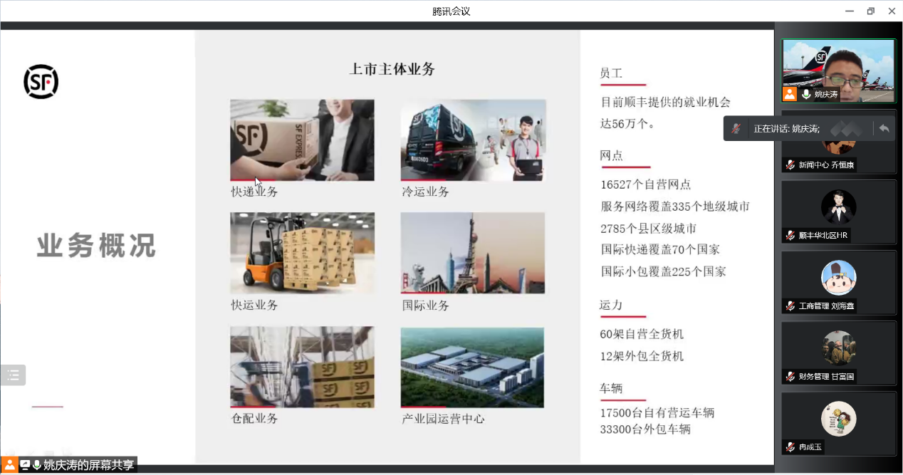 下午4点,顺丰集团华北分拨区的线上招聘宣讲会由姚庆涛经理主讲。姚经理为大家介绍到顺丰集团的发展历程,介绍了顺丰集团从创业初期到今天迈入智慧物流时代的发展轨迹,并向大家具体介绍顺丰的主要业务,包括快运、医药、冷运、同城、仓储、产业园、金融以及国际业务等众多业务,涉及范围广。紧接着,姚经理为大家重点介绍了顺丰集团的企业文化,“承诺,为每一份嘱托”。在顺丰集团企业发展的过程中逐渐形成了“成就客户、创新包容、平等尊重、开放共赢”的企业核心价值观。姚经理还特别提到了“生命摆渡人”汪勇的事迹,从一名普通的快递小哥火速升职为湖北顺丰速运有限公司分部经理,只因为在武汉疫情期间的突出表现,承担了强大的社会责任。姚经理语重心长的跟同学们强调,无论何时、身处什么岗位,都应该勇担对于社会的责任,这也是顺丰所追求的信念。随后,姚经理向毕业生们介绍了关于华北分拨区的相关介绍、职业发展通道历程以及优才/潜才计划,并向同学们具体介绍了如何加入顺丰的具体网申招聘流程。宣讲会最后,由顺丰华北区HR李经理为大家解答有关薪资待遇以及工作时间安排等具体问题。