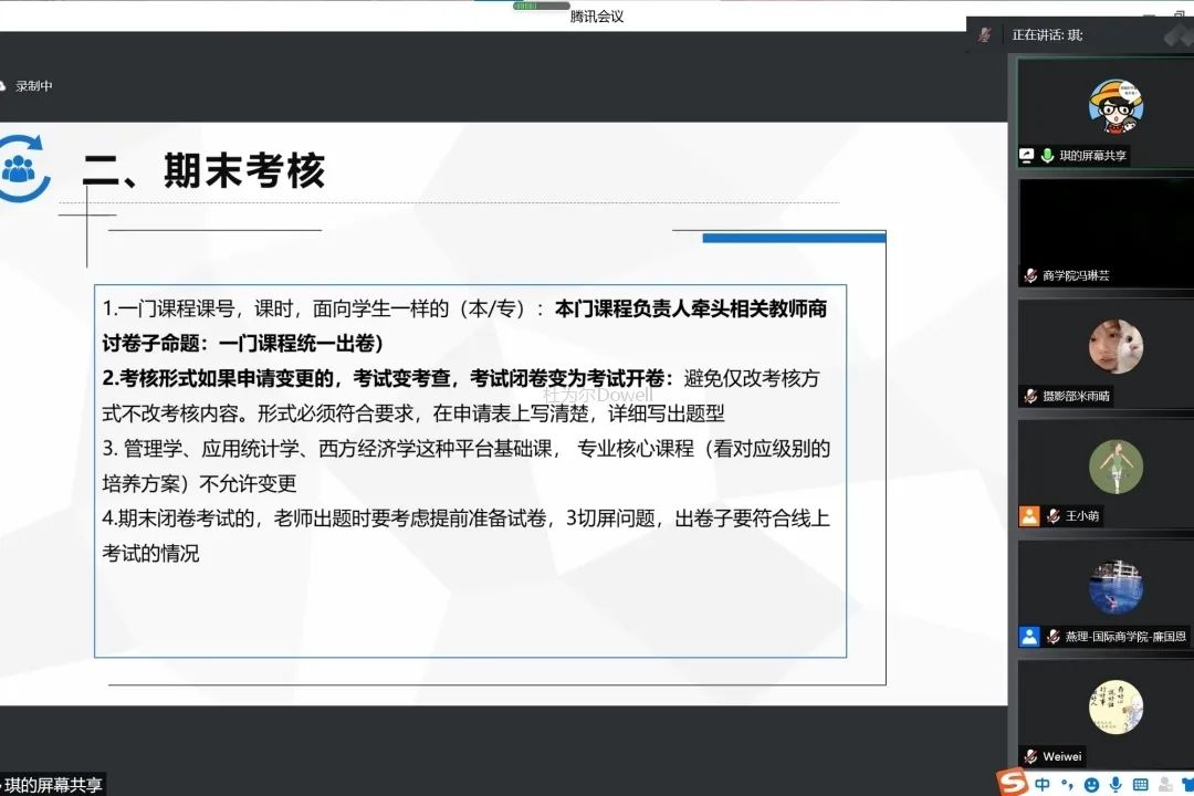 随后,国际商学院张可心老师在考试安排、命题要求、考核形式和其他要求四个方面对商学院本学期期末考核工作进行了详细的分析。陈茜老师表示,课程考核是考核学生水平的主要方式,更是保证人才培养质量的重要环节,这就要求商学院各教学单位要认真做好期末考核工作,认真研究并积极推进考核方式创新。