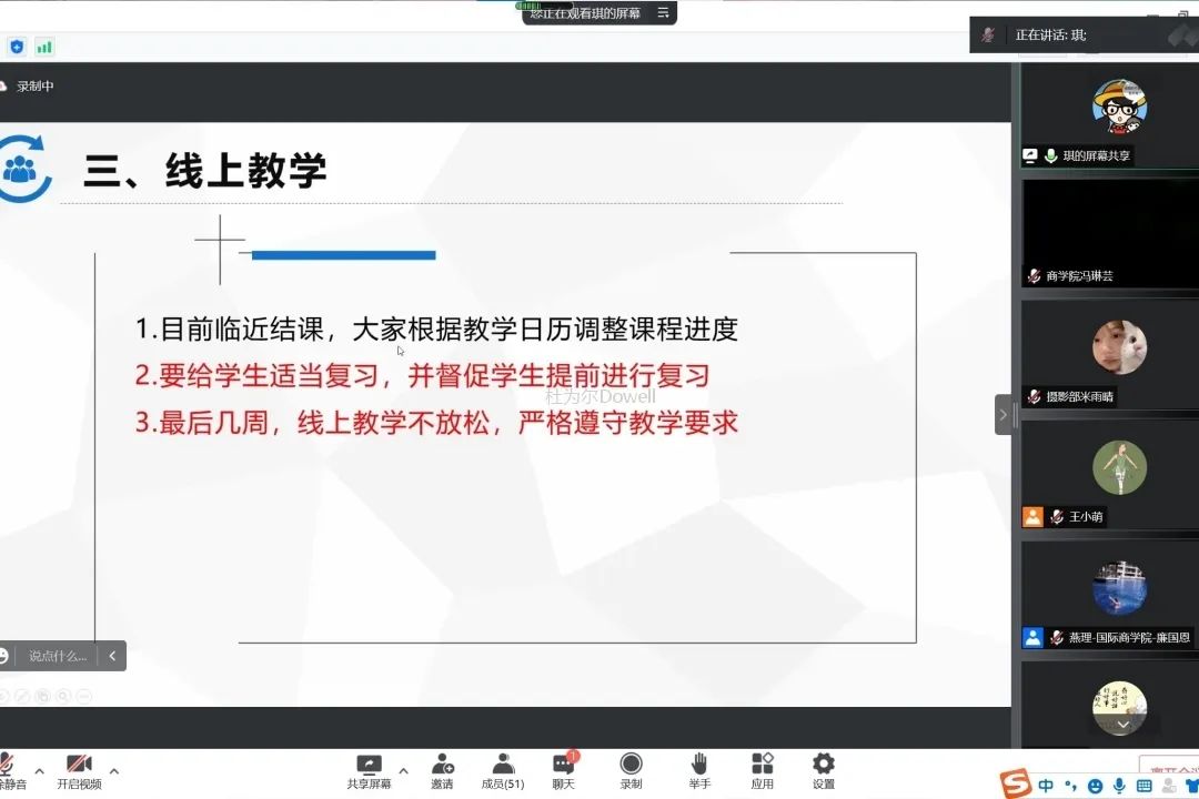 会议最后由廉国恩院长对线上教学工作进行总结分析。廉国恩院长对于线上教学工作提出三点要求:第一,目前临近结课,要根据教学日历调整课程进度;第二,教师要给学生适当复习,并督促学生提前进行复习;第三,最后几周,线上教学不放手,严格遵守教学要求。廉国恩院长提到,国际商学院要在思想上团结一心,在领导班子的带领和全体教职工的共同努力下,国际商学院线上教学工作会日益完善,越做越好。