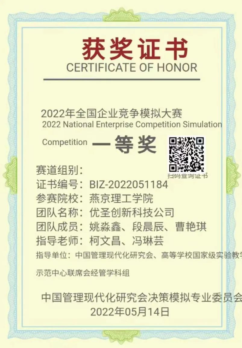 2022年5月14日,企业竞争模拟大赛全国总决赛圆满落幕。国际商学院姚淼鑫、曹艳琪、段晨辰三位同学组成的“优圣创新科技公司”队荣获企业运营赛道本科组全国一等奖!