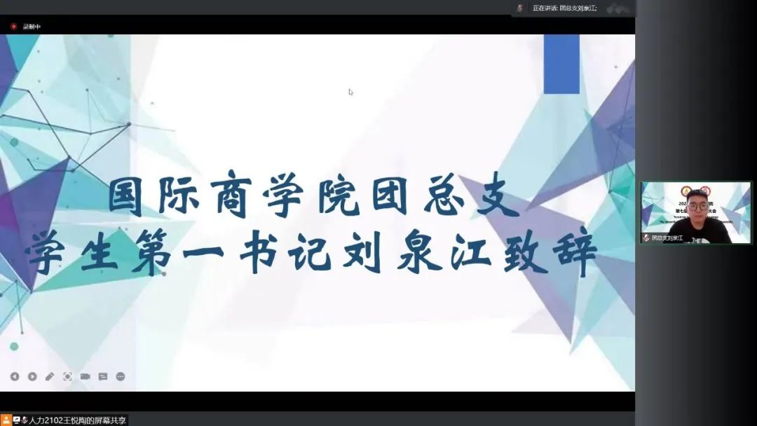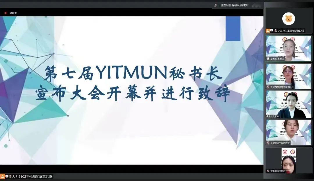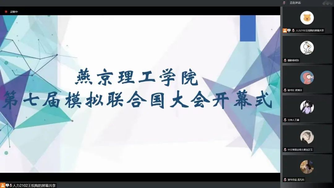 7月6日,国际商学院线上举行第七届模拟联合国大会开幕式。国际商学院团总支指导老师侯金慧老师,团总支书记处成员:刘泉江、唐筱涵,第七届模拟联合国秘书长高博洋、中文常规会场主席刘芷玉、中文特殊会场主席徐英美、英文常规会场主席梁译文参加开幕式。开幕式由王澜主持,第七届模拟联合国秘书长高博洋致开幕词。