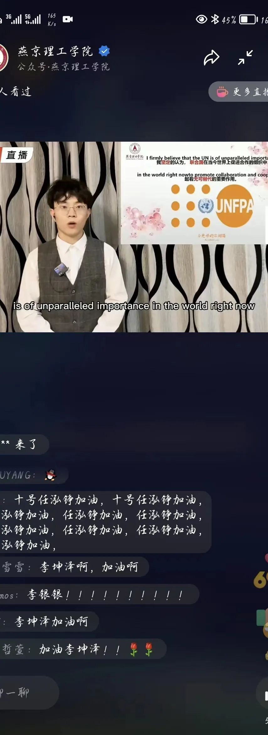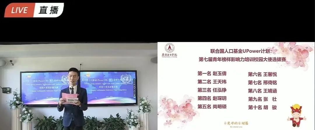 7月6日下午,联合国人口基金UPower计划:燕京理工学院第七届青年榜样影响力项目校园大使选拔赛决赛在视频号和微博平台进行直播。燕京理工学院党委常务副书记、副校长刘元园,副校长王传超和各二级学院主管学生工作副院长在线上参加了活动。