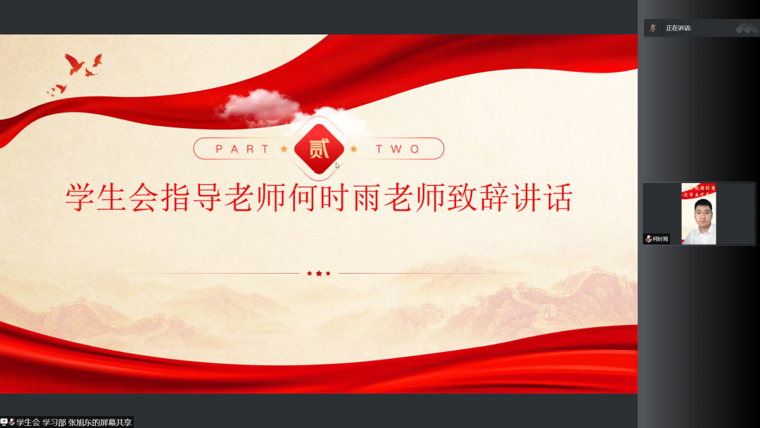 学生会学习部部长张旭东同学作总结发言,希望学生干部们可以以身作则,明确任务,开拓创新,更好地认识自我,发展自我,完善自我。