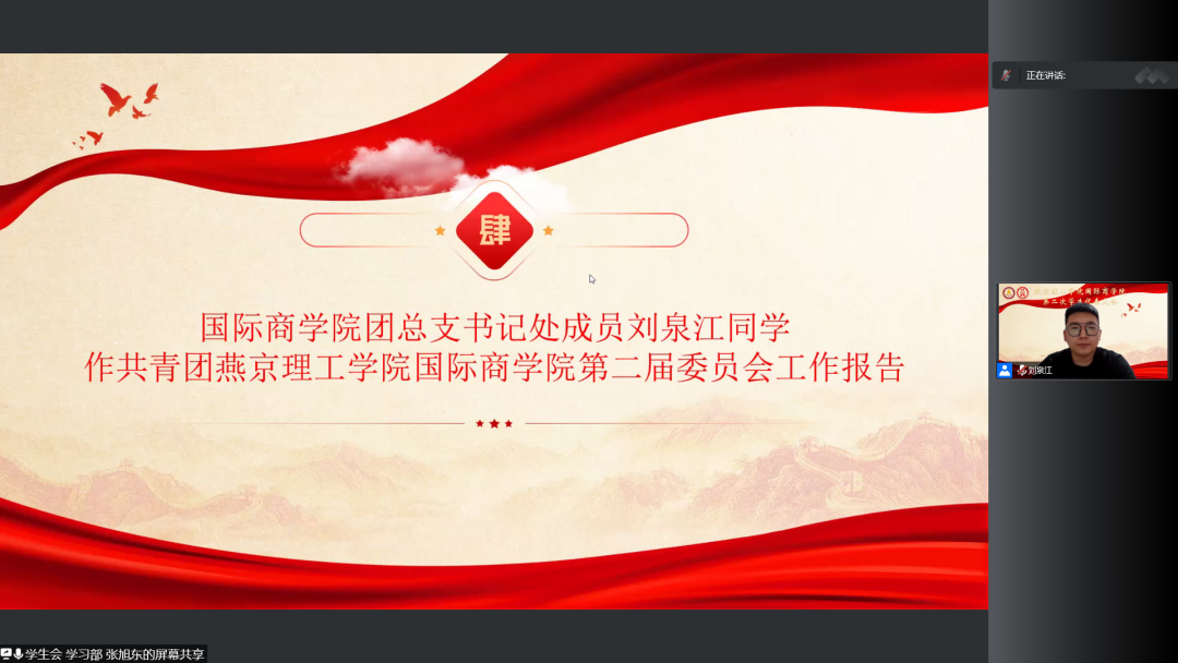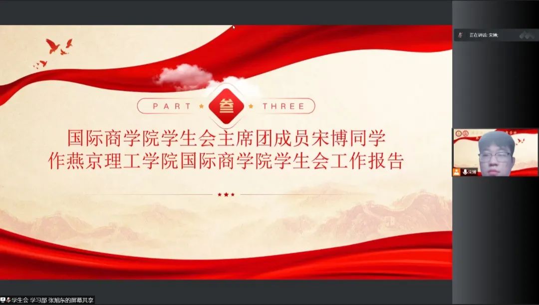 国际商学院学生会主席团成员宋博同学作燕京理工学院国际商学院学生会工作报告。宋博同学表示:国际商学院学生会始终明确“从同学中来,到同学中去”的服务意识,塑造扎实的工作作风,为校园建设添砖加瓦。在过去的一年里,国际商学院学生会在院领导的统一指导下,坚持“团结、务实、诚信、创新”的工作作风,完成迎新活动、座谈会、加强学风建设以及学生会自查等各项工作,并对未来学生会工作作好规划,共创美好未来。