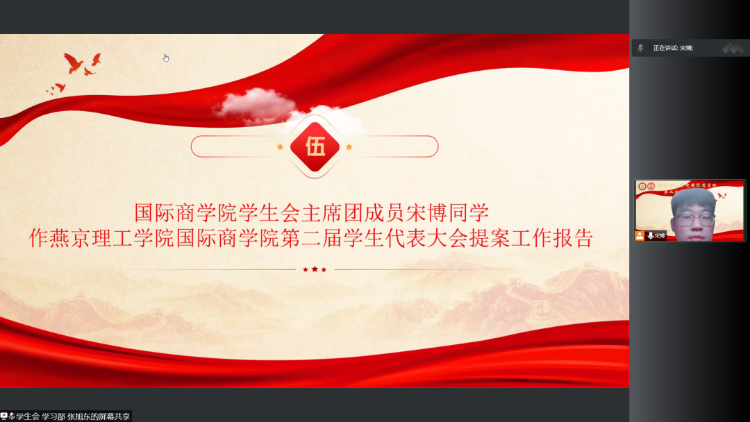 随后,宋博同学作燕京理工学院国际商学院第二届学生代表大会提案工作报告。他指出第二次学代会提案征集情况及议案情况说明,其中议案涵盖疫情防控、教学管理等方面,真正做到“为同学服务”,为学生改革创新转型发展贡献青春力量。