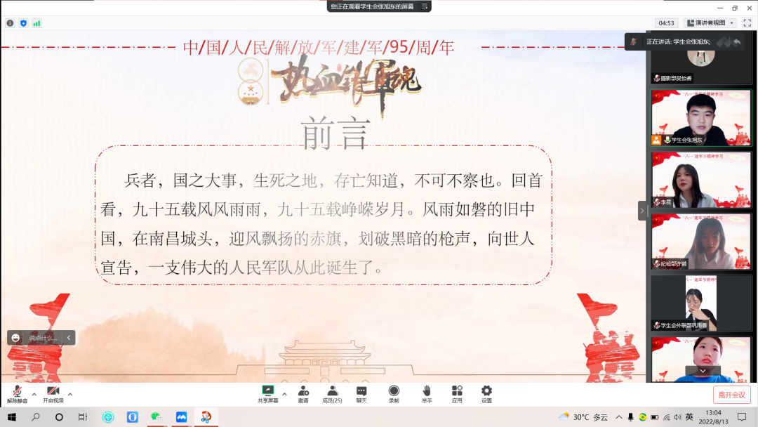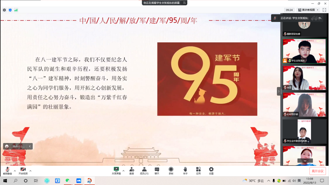 为热烈庆祝中国人民解放军建军95周年,弘扬时代精神,赓续红色血脉,燕京理工学院国际商学院于8月13日开展“庆祝中国人民解放军建军95周年”主题教育活动,进行“八一”建军节精神学习。国际商学院学生会成员参加此次活动。