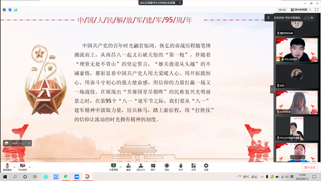 同学们首先对中国人民解放军建军95周年表示了热烈庆贺。随后,国际商学院学生会代表张旭东同学进行发言,带领同学们回顾中国人民解放军的光辉历史,深刻体会伟大的解放军精神。