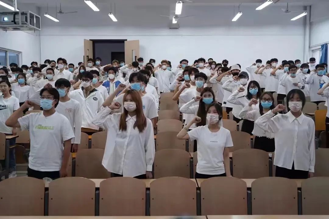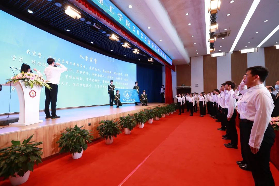 在国际商学院2019级财务管理专业吴柏松、文法学院2020级小学教育专业张心雨的带领下,全体新生面向校旗入学宣誓:作为燕京理工学院学生,秉承校训,勤奋创新 璞玉成器,尊师重道,明德励志,博学笃行,共担共享,争做会做人、会学习、会做事、会与人共处;有感恩知心、有博大胸怀、有吃苦精神、有创新意识、有创业能力的时代新人,胸怀家国天下,追求卓越进步,肩负伟大使命,建设现代强国,献身民族复兴!