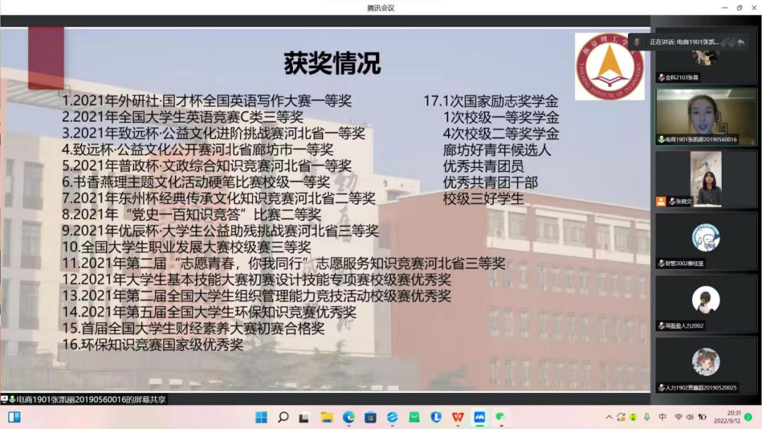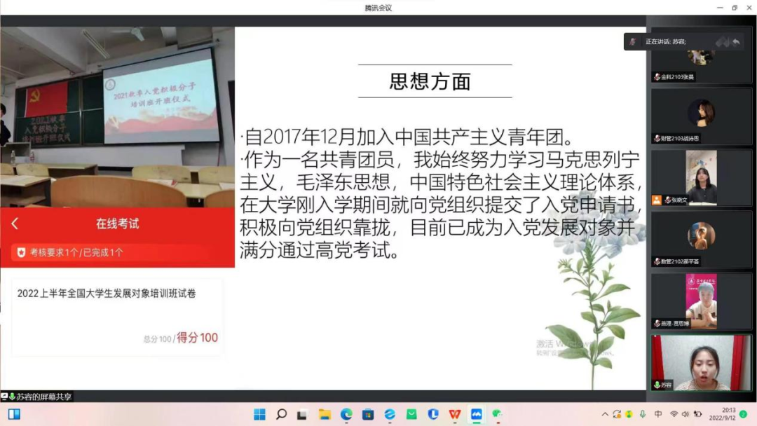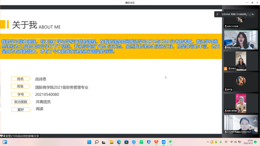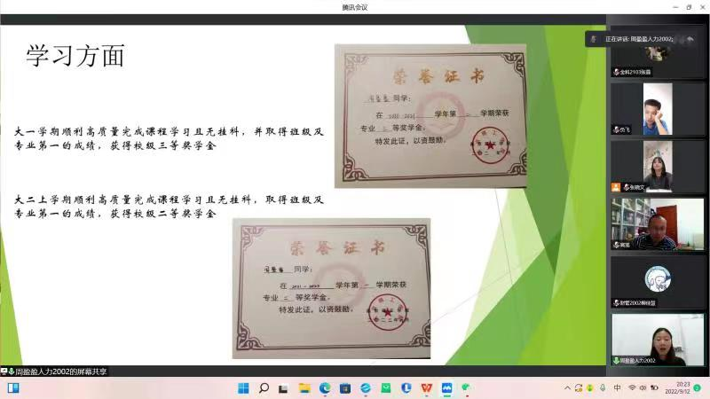 评审会通过学生申请、评审小组评议最终选出9名候选人,9名同学依次发言,从个人学习成绩、思想动态、创新实践、所获荣誉等方面展示了他们在校期间取得的成果,也让老师们见证了他们的进步。