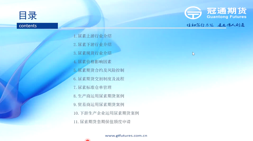梳理完基本知识之后,王晓囡经理开始了本次课程的核心环节——尿素品种分析。尿素期货于2019年8月9日在郑商所上市,代码UR。王晓囡经理从尿素上游行业、尿素下游行业、尿素现货行业、尿素价格影响因素、尿素期货合约及风险控制、尿素期货合约交割制度及流程、尿素标准仓单管理到尿素期货套期保值额度申请,对整个尿素品种的基本面进行了梳理和分析。为了让大家更好的对尿素这一品种有所把握,王晓囡经理重点就尿素基本概念及相关指标、产业链、价格变动主要影响因素等做了详细分析。
