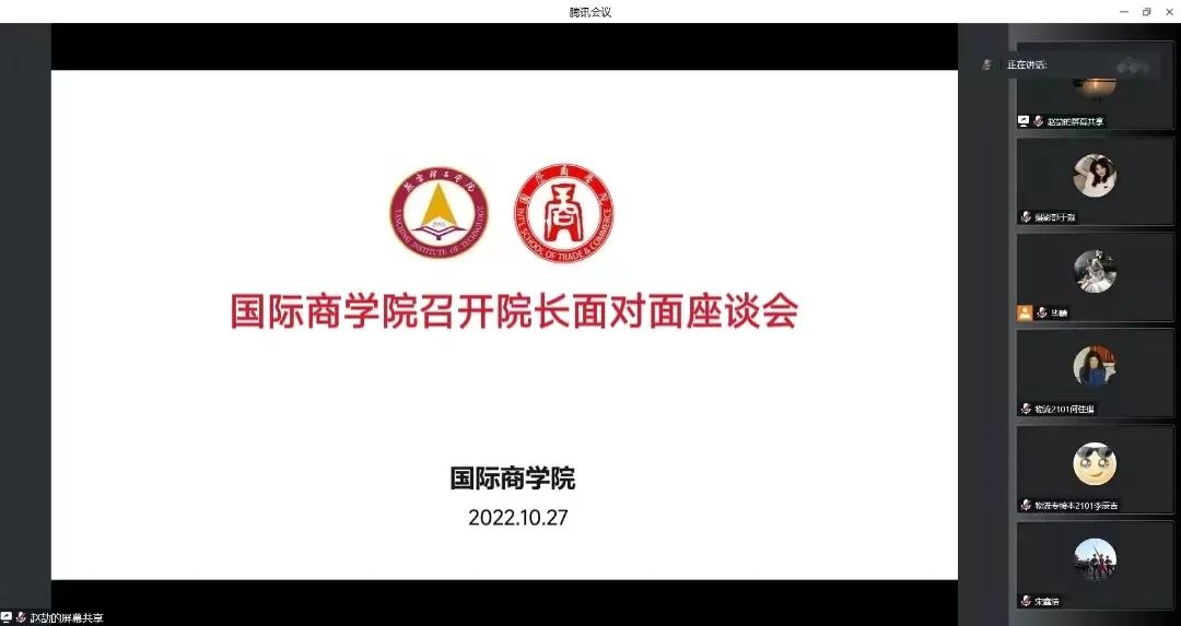 为促进国际商学院优良院风、学风建设,更好的关心学生校园生活,解决学生的问题。10月27日,国际商学院召开线上院长面对面座谈会。张琪副院长以及各年级学生代表参加此次会议。