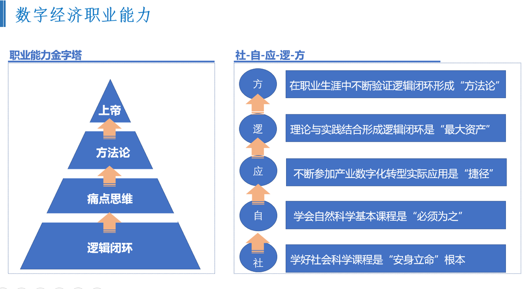 第三部分,韩博士重点讲授了数字经济人才应该具备的职业能力。不同于工科类专业的学生,数字经济专业的学生应该“学懂”技术类课程、“学精”业务类课程,最终具备“上帝视角”,为现实问题找“痛点”。韩博士特别强调:问题导向是数字经济专业人才培养的主线,能够应用数字经济基本理论,识别宏观经济、三次产业与微观企业中数字化转型过程的“痛点”,并通过经济学、数据科学与统计学的基本方法,初步形成解决问题的方案、架构,协同技术人员与业务人员,构建解决“痛点”问题的整体解决方案,促成项目落地和决策生成。