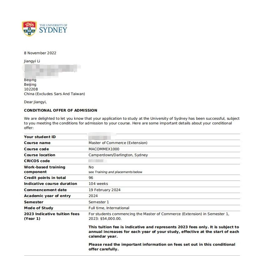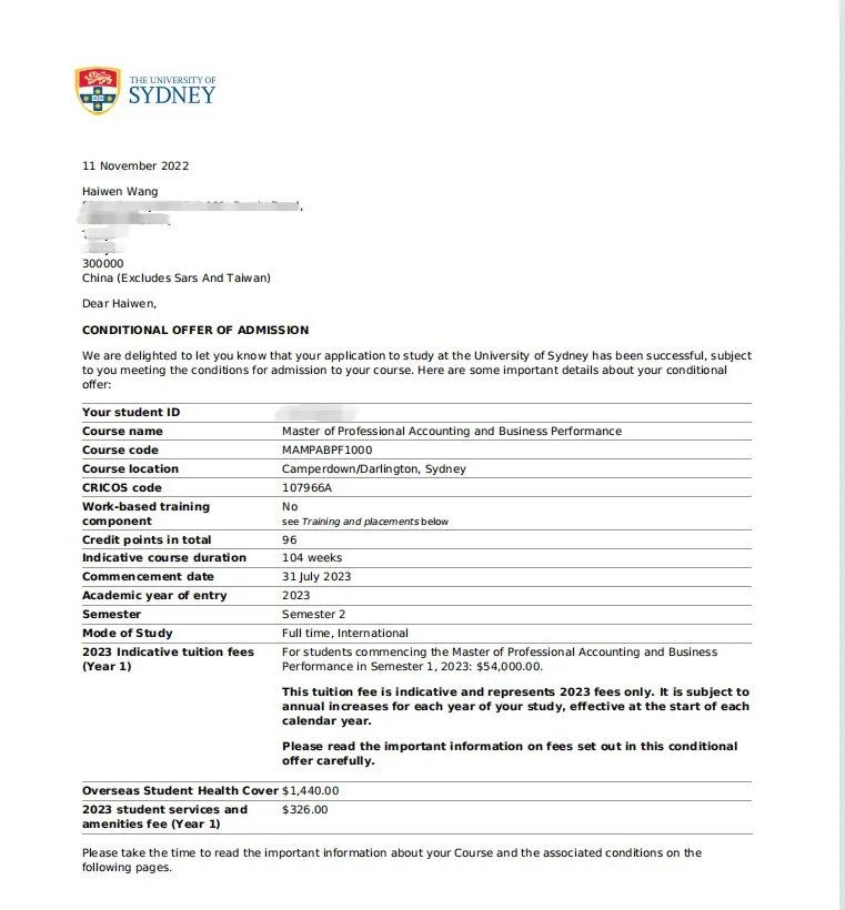会计学院2019级会计专业王海雯同学获得悉尼大学(2023年QS世界排名第41)会计和商业绩效专业硕士offer。