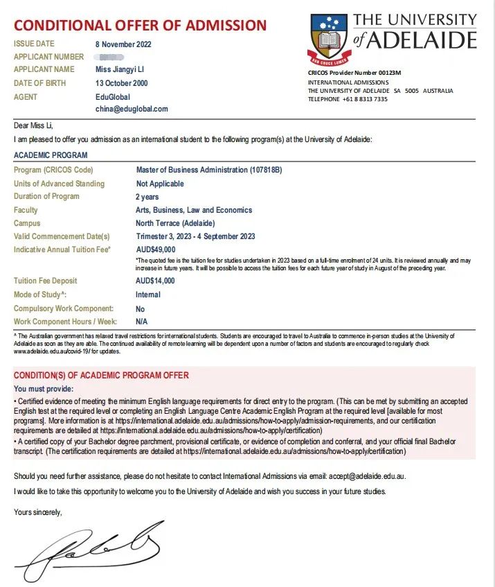 传媒学院2019级广播电视编导专业李江怡同学获得悉尼大学(2023年QS世界排名第41)商业专业硕士offer和阿德莱德大学(2023年QS世界排名第109)工商管理专业硕士offer。