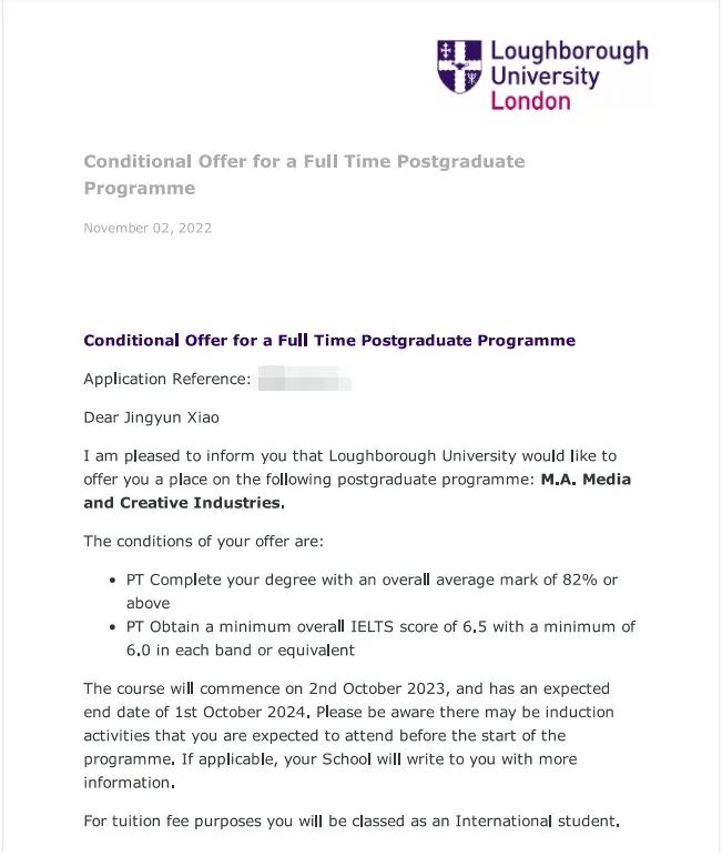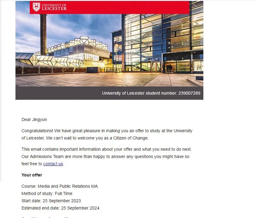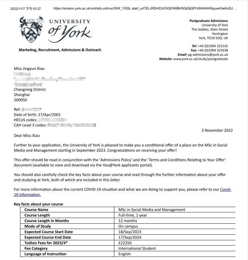 传媒学院2019级广播电视编导专业肖景昀同学获得约克大学(2023年QS世界排名第162)社会媒体与管理专业硕士offer、拉夫堡大学(2023年QS世界排名第256)媒体与创意产业专业硕士offer和莱斯特大学(2023年QS世界排名第279)媒体与公共关系专业硕士offer。