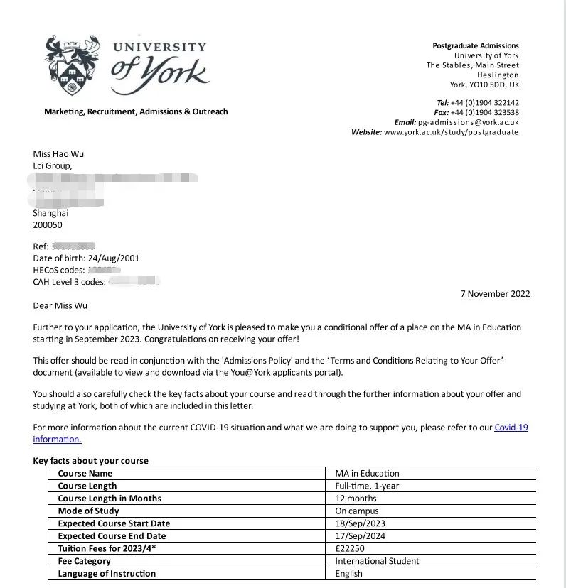 文法学院2019级学前教育专业吴昊同学获得纽卡斯尔大学(2023级QS世界排名第122)教育学专业硕士offer和约克大学(2023级QS世界排名第162)教育学专业硕士offer。