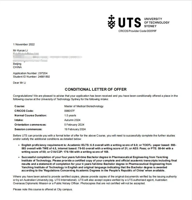 环境与健康学院2019级制药专业李坤泽同学获得悉尼科技大学(2023年QS世界排名第137)医学生物技术专业硕士offer。