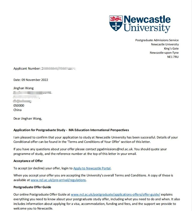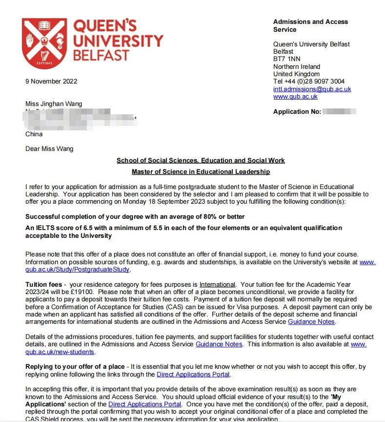 文法学院2019级英语专业王婧涵同学获得纽卡斯尔大学(2023年QS世界排名第122)教育学专业硕士offer和贝尔法斯特女王大学(2023年QS世界排名第233)教育领导力专业硕士offer。
