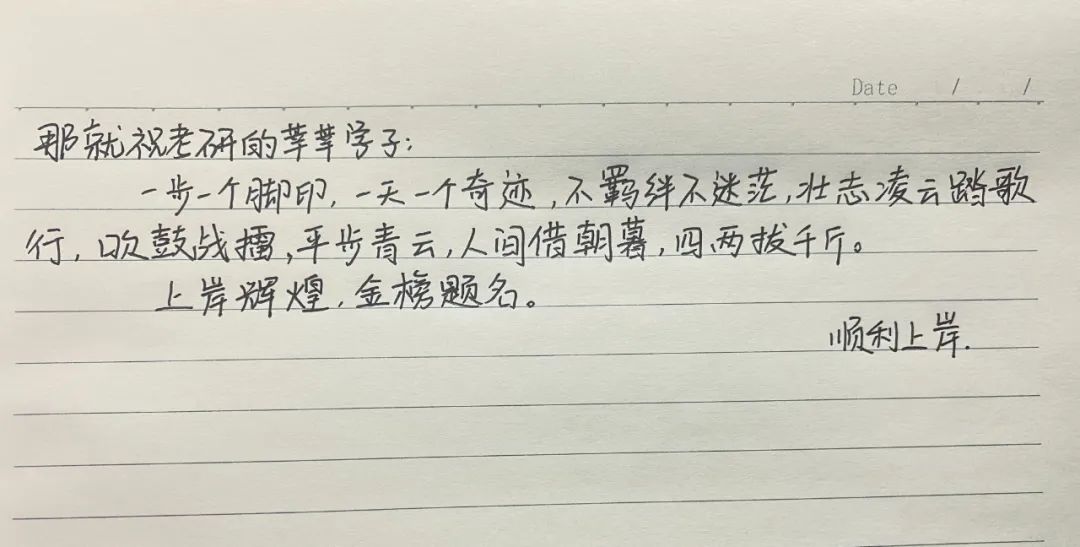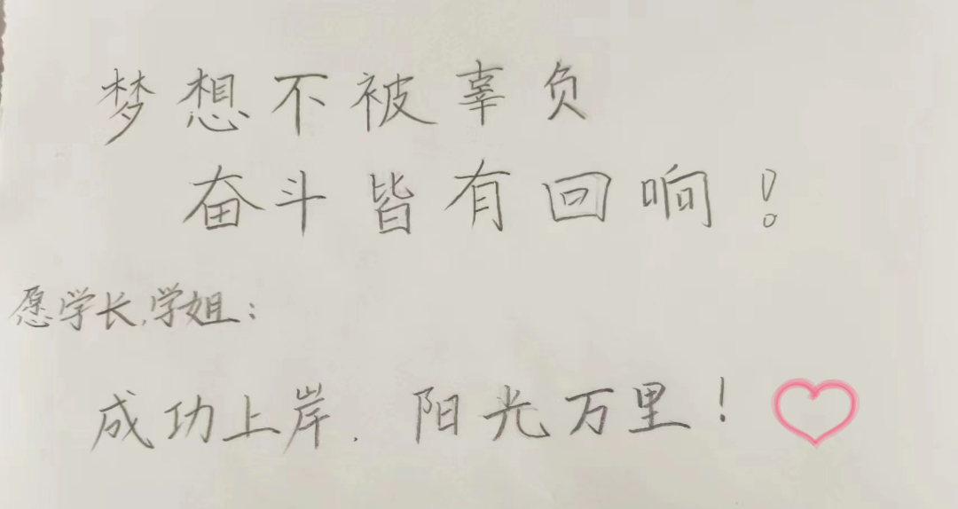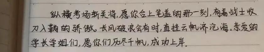 纵横考场新关将,愿你合上笔盖的那一刻,有着战士收刀入鞘的骄傲。长风破浪会有时,直挂云帆济沧海。亲爱的学长学姐们,愿你们历尽千帆,成功上岸。