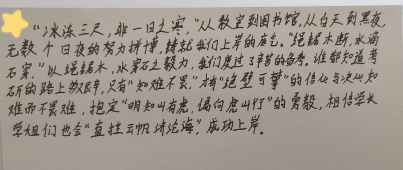 “冰冻三尺,非一日之寒,从教室到图书馆,从白天到黑夜,无数个日夜的努力拼博,铸就我们上岸的庭气。“绳锯木断,水滴石穿”以绳锯木,水穿石之毅力,我们度过了苦的备考。谁都知道考斫的路上多良辛,只有“知难不畏,”才有“绝壁可攀”的信化与决心知难而不畏难,抱定“明知山有虎,偏向虎山行”的勇毅,相信学长学姐们也会“直挂云帆济论海”成功上岸。