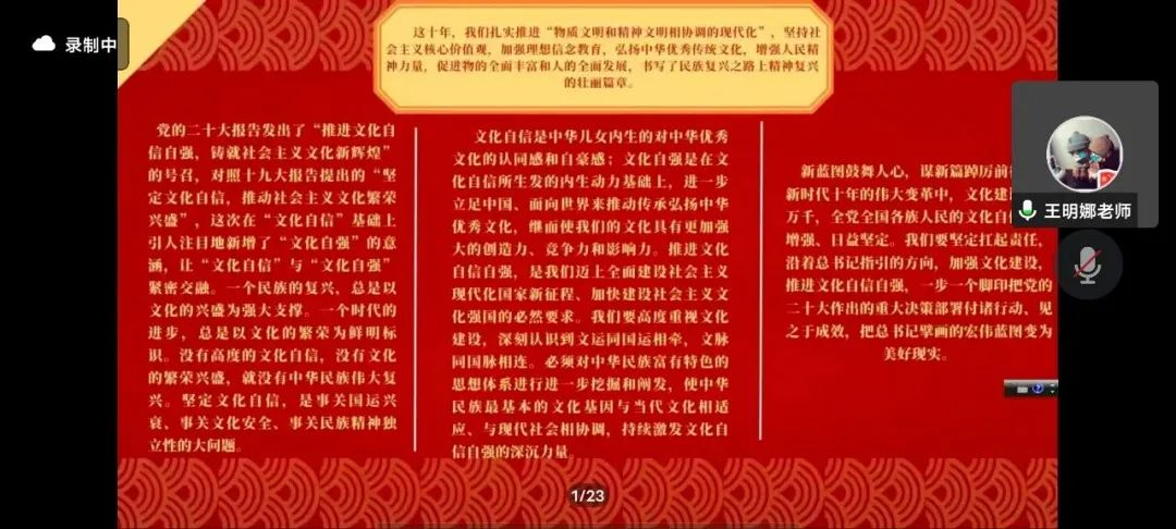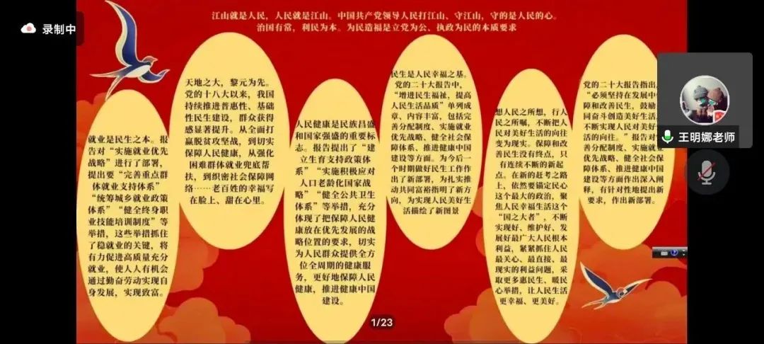 本次宣讲中,王明娜老师从加快构建新发展格局,着力推动高质量发展、实施科教兴国战略,强化现代化建设人才支撑、推进文化自信自强,铸就社会主义文化新辉煌、增进民主福祉,提高人民生活品质、推动绿色发展,促进人与自然和谐共生等五个方面进行宣讲,让同学们对党的二十大会议精神有了更深刻的认识。党的二十大担负着全党的重托和人民的期待,从战略的角度阐述了坚持发展新时代中国特色社会主义的必要性,以科学的角度谋划了国家发展事业的大政方针,在党和国家历史上具有重大而深远的意义。