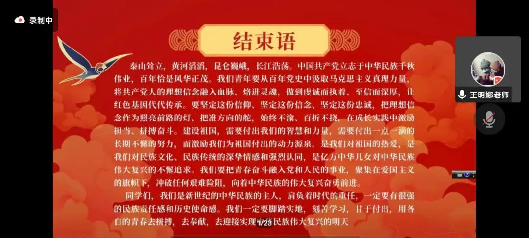 宣讲最后,王明娜老师希望同学们将共产党人的理想信念融入血脉,让红色基因代代传承。同样希望同学们做新世纪中华民族的主人,肩负时代重任,用青春去拼搏创造,为中华民族伟大复兴贡献自己的一份力量。