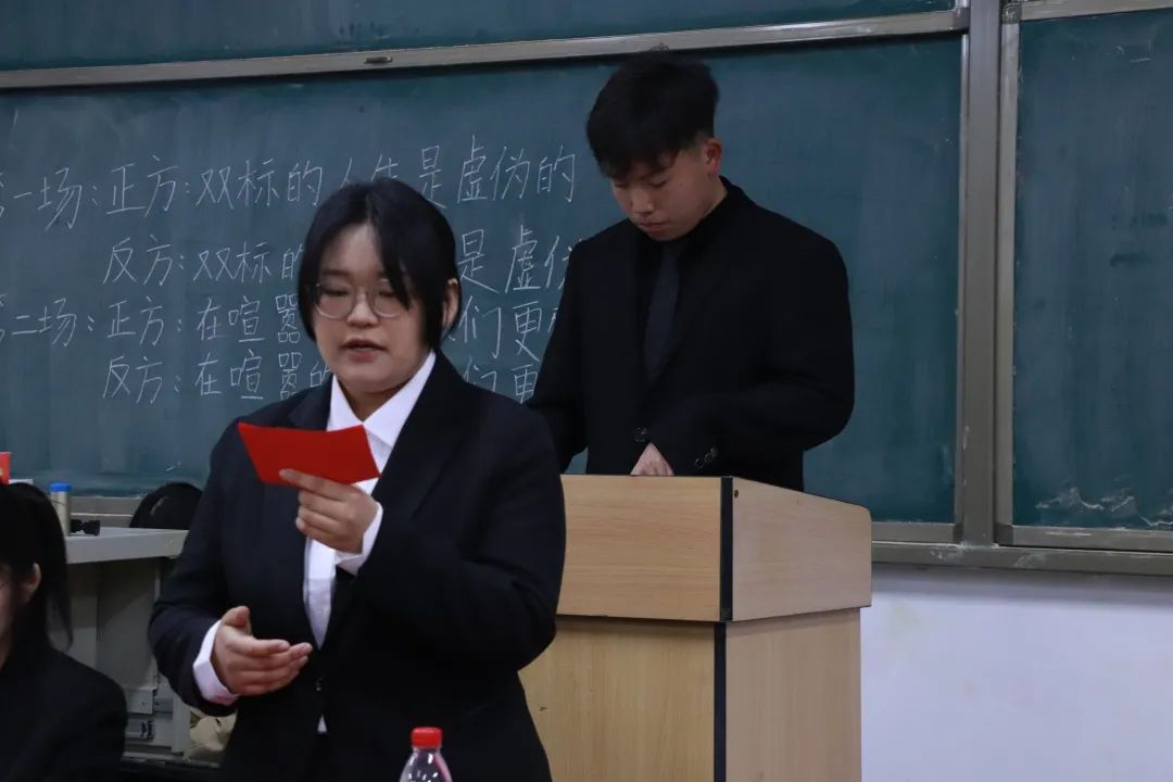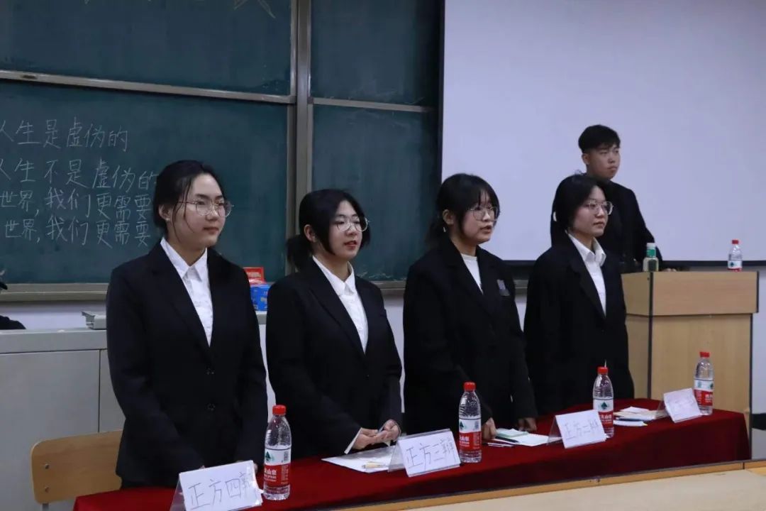 正反双方开宗明义,引经据典,将理论与现实结合在一起,以自己的辩题为基础,深化剖析。正方辩手以我们对不同的人有不同的态度为切入点,抓住“虚伪”这个关键词,来强调“双标的人生是虚伪的”,反方则是从依托现实,根据事实需要来阐述,论证“双标的人生不是虚伪的”。