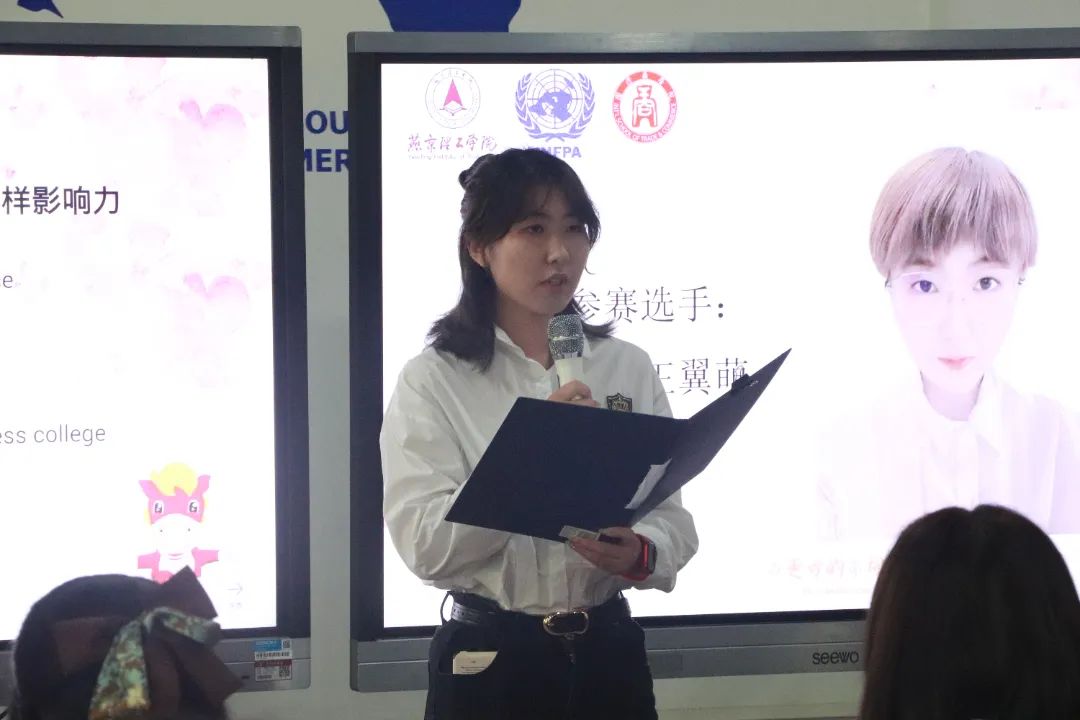 活动开始,主持人宣讲活动评选规则。接下来,是各位选手的展示时间,他们采取不同形式,围绕消除贫困、性别平等、气候变化等主题,中英文结合“自我介绍+主题演讲”。他们手中持有的不仅是话筒,还有一颗渴望通过话筒走向世界的心。他们声音响亮,口齿流利,观点清晰,充分展示着国商学子的家国情怀和使命担当。
