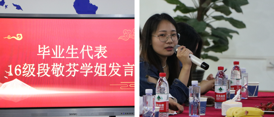 接下来由16级学姐段敬芬,17级学长赵威,18级学姐陈佳琪进行发言。段敬芬学姐分享到:在母校的时光让她追忆,在校园的生活让她留恋,如今虽已毕业,但对母校的感恩之情不会忘怀,同时学姐也祝愿国际商学院发展越来越好,学校的未来越来越辉煌。“四年大学生活转瞬即逝,再回校园,看见学弟学妹们的稚嫩脸庞和眼神中对未来无限的憧憬,让我回忆起了当年的青春时光”这是赵威学长的分享。关于学习方面,海外升硕学姐陈佳琪分享到:“要坚持学习,积极备考,保持一个良好的心态,相信自己定会在未来大放光彩。”