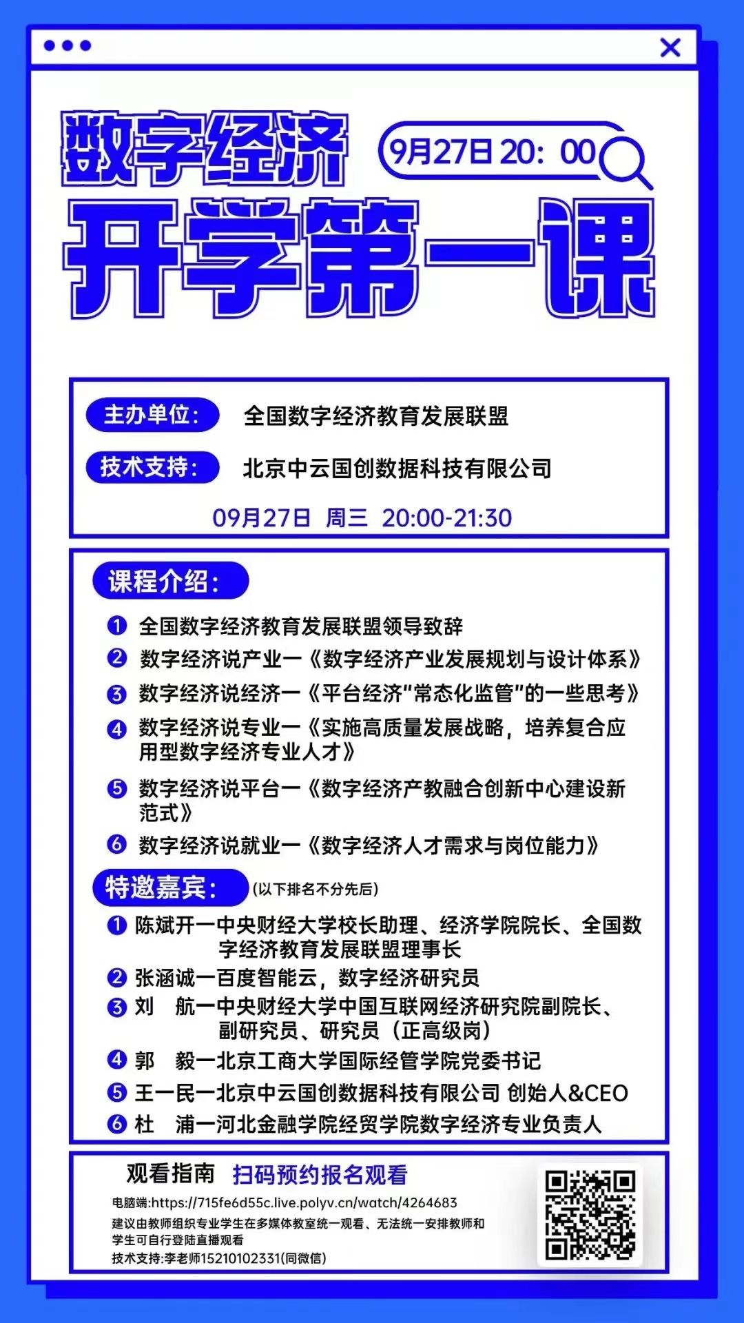 2023年9月27日20:00,由全国数字经济教育发展联盟主办、北京中云国创数据科技有限公司提供技术支持的“数字经济开学第一课”如期举行线上直播,数字经济专业全体教师携2022和2023级数字经济本科生一起参会学习。