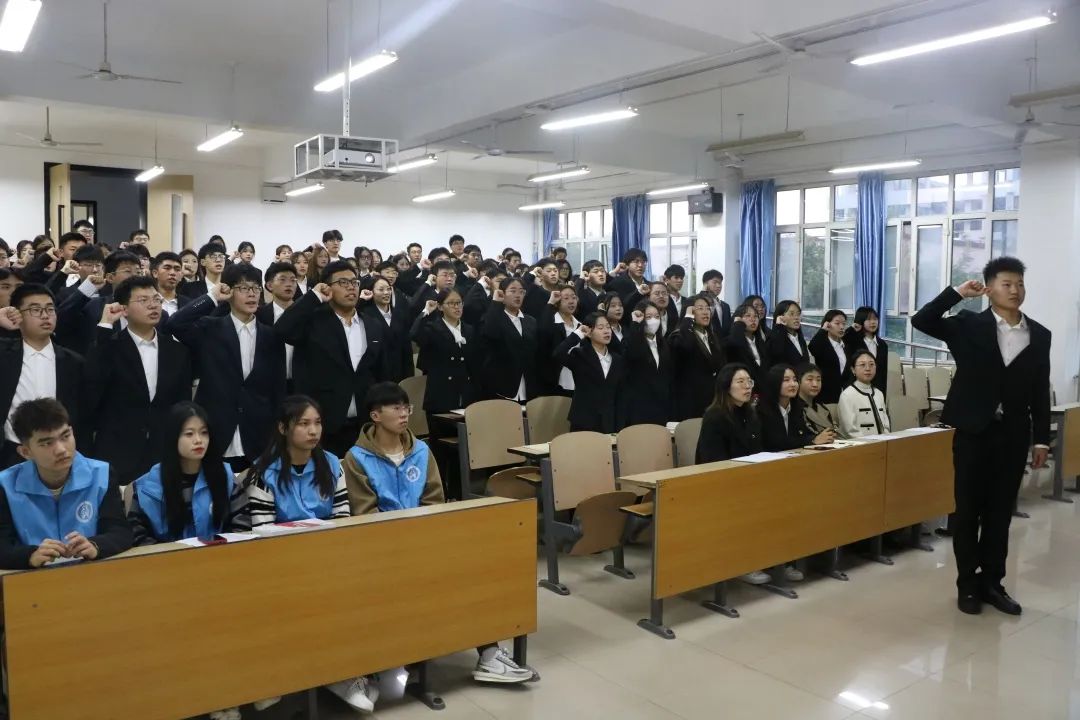 遵守纪律是每一名入党积极分子的前提要求,由国际商学院党总支宣传委员王萌萌为同学们宣读了《入党积极分子培训班纪律要求》,希望全体学员严格遵守纪律要求,高质量完成本次培训。同时由靳志超同学带领全体新学员起立共同宣誓,“以我微光助国荣光”铿锵有力的誓言表现出每一位新学员对党的热爱与坚定决心。