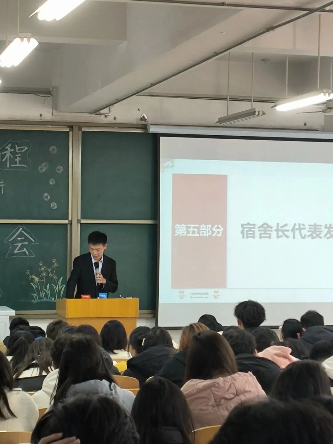 大会第三项由优秀宿舍长孙泽宇发言。优秀宿舍长孙泽宇带领宿舍成员共同营造温馨和谐,积极向上的宿舍氛围,让宿舍每一位成员感受到家的温暖和关爱。