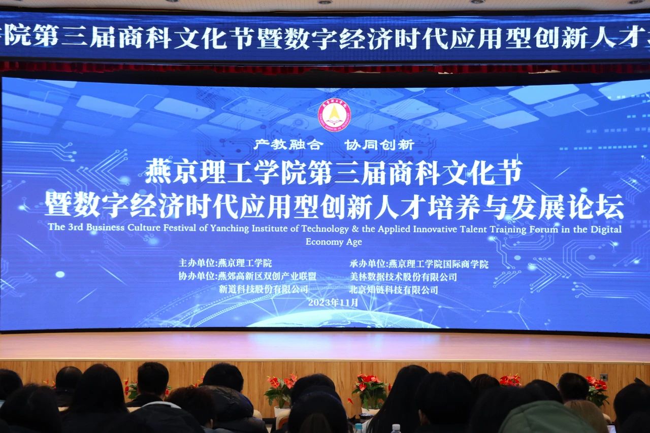 为进一步弘扬商科文化,深化产教融合,培养学生创新思维和提升实践能力,培育适应数字经济时代的应用型创新人才,11月16日、17日,燕京理工学院携手燕郊高新区双创产业联盟、美林数据技术股份有限公司、新道科技股份有限公司、北京知链科技有限公司举办以“产教融合,协同创新”为主题的第三届商科文化节暨数字经济时代应用型创新人才培养与发展论坛。