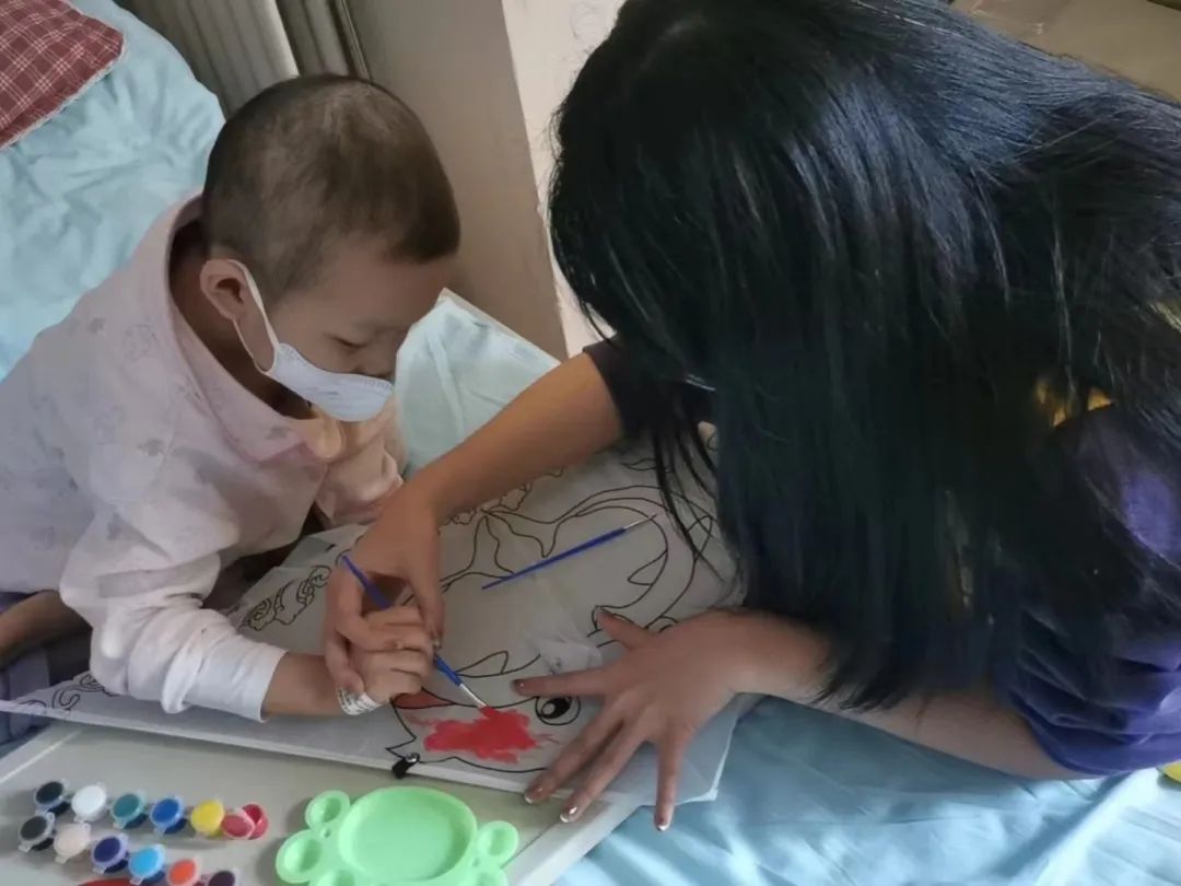 志愿者们来到了小朋友们的病房陪伴他们一起画风筝,他们拿出五颜六色的颜料,同小朋友们一起,将颜料仔细地涂在风筝上,为风筝画上美丽的图案。志愿者们手把手教小朋友们创作出独属于自己的独特的风筝。相信在不久的将来,小朋友们也会像这一只只风筝一样无拘无束的在天地间翱翔。