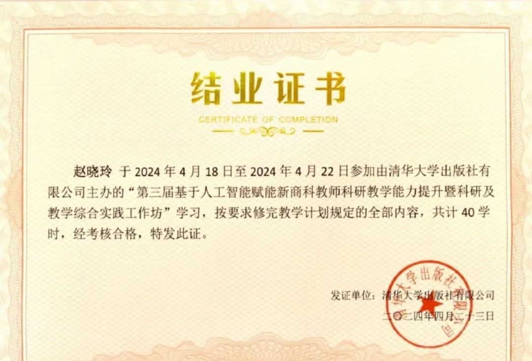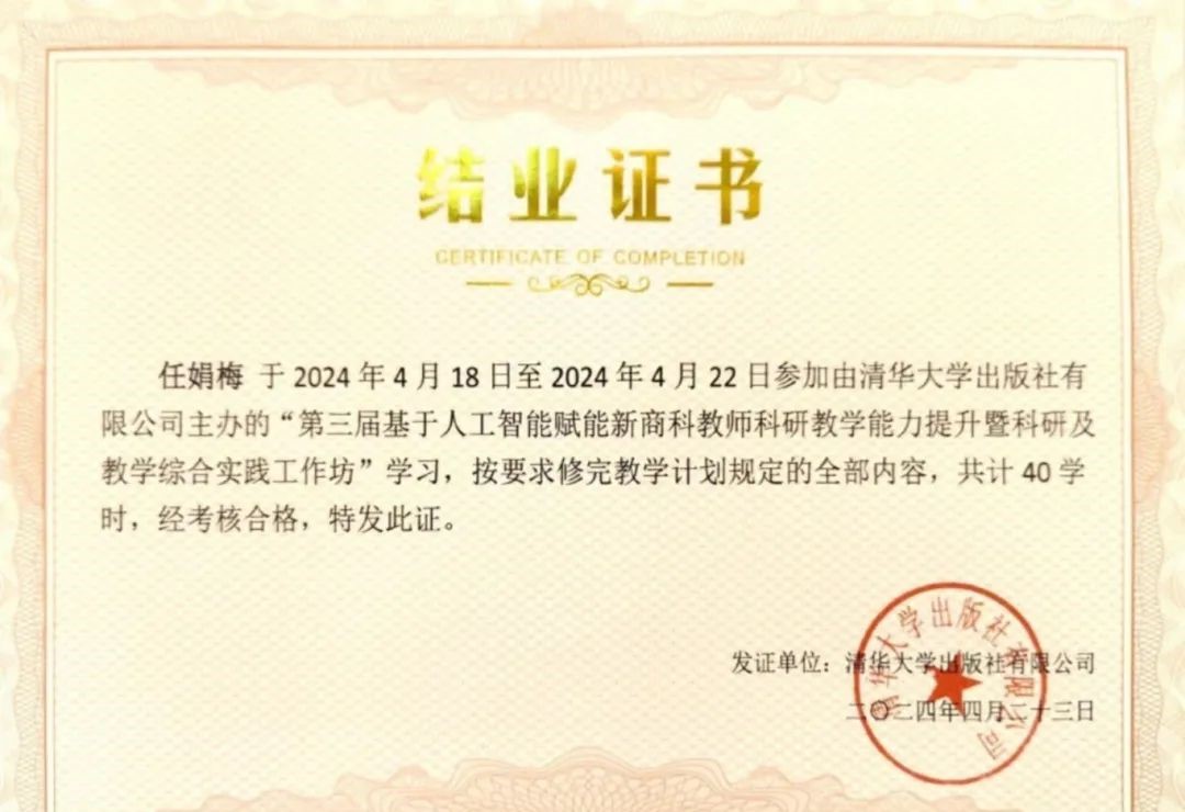 为深入推进人工智能新技术与教师队伍建设的融合,推动教师主动适应人工智能等新技术变革,积极有效开展新商科教学科研。在数字经济产业学院的组织下,2024年4月19日至22日,燕京理工学院国际商学院大数据管理与应用专业教师赵晓玲与人力资源管理专业教师任娟梅,赴珠海参加第三届基于人工智能赋能新商科教师科研教学能力提升暨科研及教学综合实践工作坊培训。