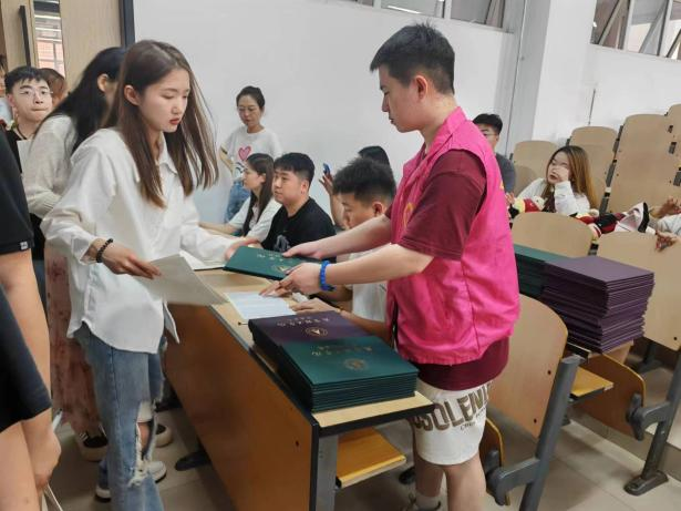 6月14日,国际商学院学生会的工作人员提前到教学楼做工作部署,进行毕业证的颁发,学生会工作人员分工细致,认真负责的为学长学姐分发毕业证书,现场秩序井然、稳步推动。