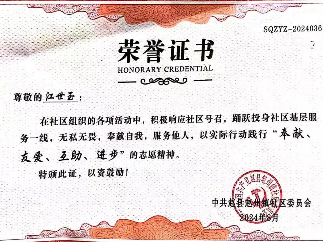 信中提到,暑假期间赵州镇正处于闷热的桑拿天,江世玉同学不顾天气的炎热,以坚持不懈的精神和认真负责的态度,积极投身于社区志愿服务。在本次实践活动中,江世玉同学主要负责宣传惠民政策、辖区排查和暑假公益托管活动。江世玉走访辖区看望老党员,带去了温暖的问候与关怀,认真聆听他们的故事和人生经验,并为老党员送上了精心准备的礼物。江世玉同学的奉献精神和责任意识不仅赢得了社区人民的赞誉也代表了当代大学生的积极向上的风貌和强烈的社会责任感。